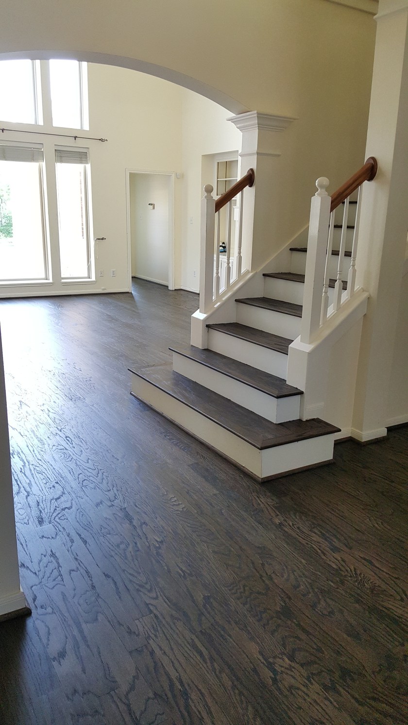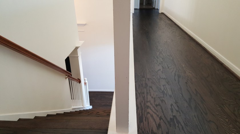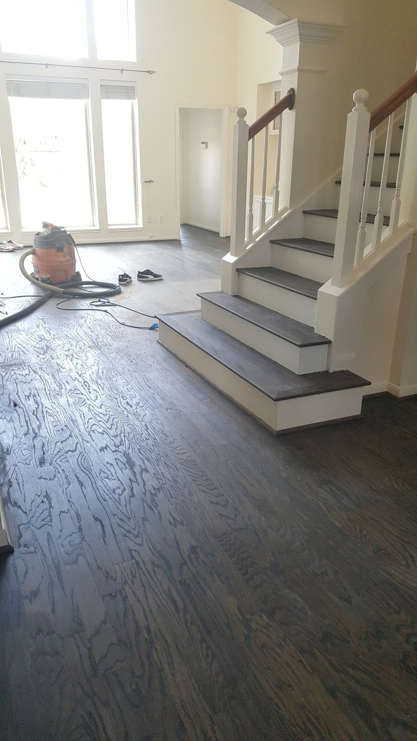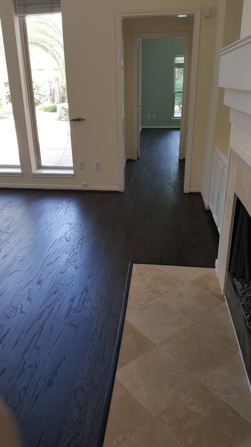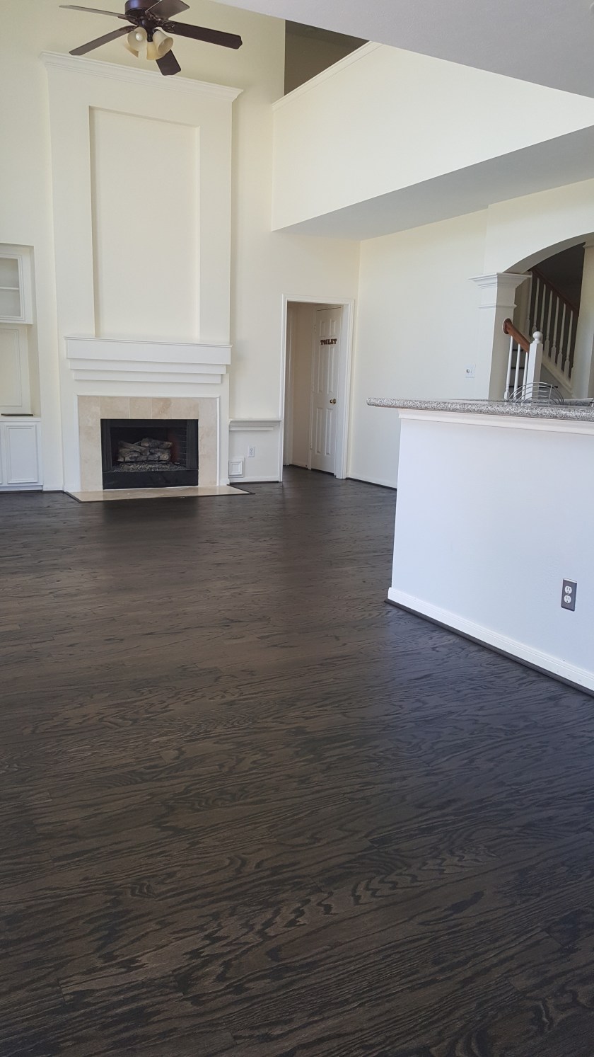OLDER ENGINEERED WOOD FLOOR NEEDED TO BE UPDATED , NICE COUPLE ALLOWED US TO DO THE REFINISHING. WE SANDED FLOOR TO A RAW SURFACE, DID A CONDITIONER THEN APPLIED A COAT OF EBONY STAIN AND 2 COATS OF OIL MODIFIED MATTE FINISH.