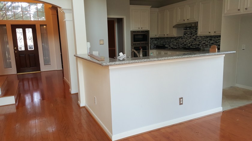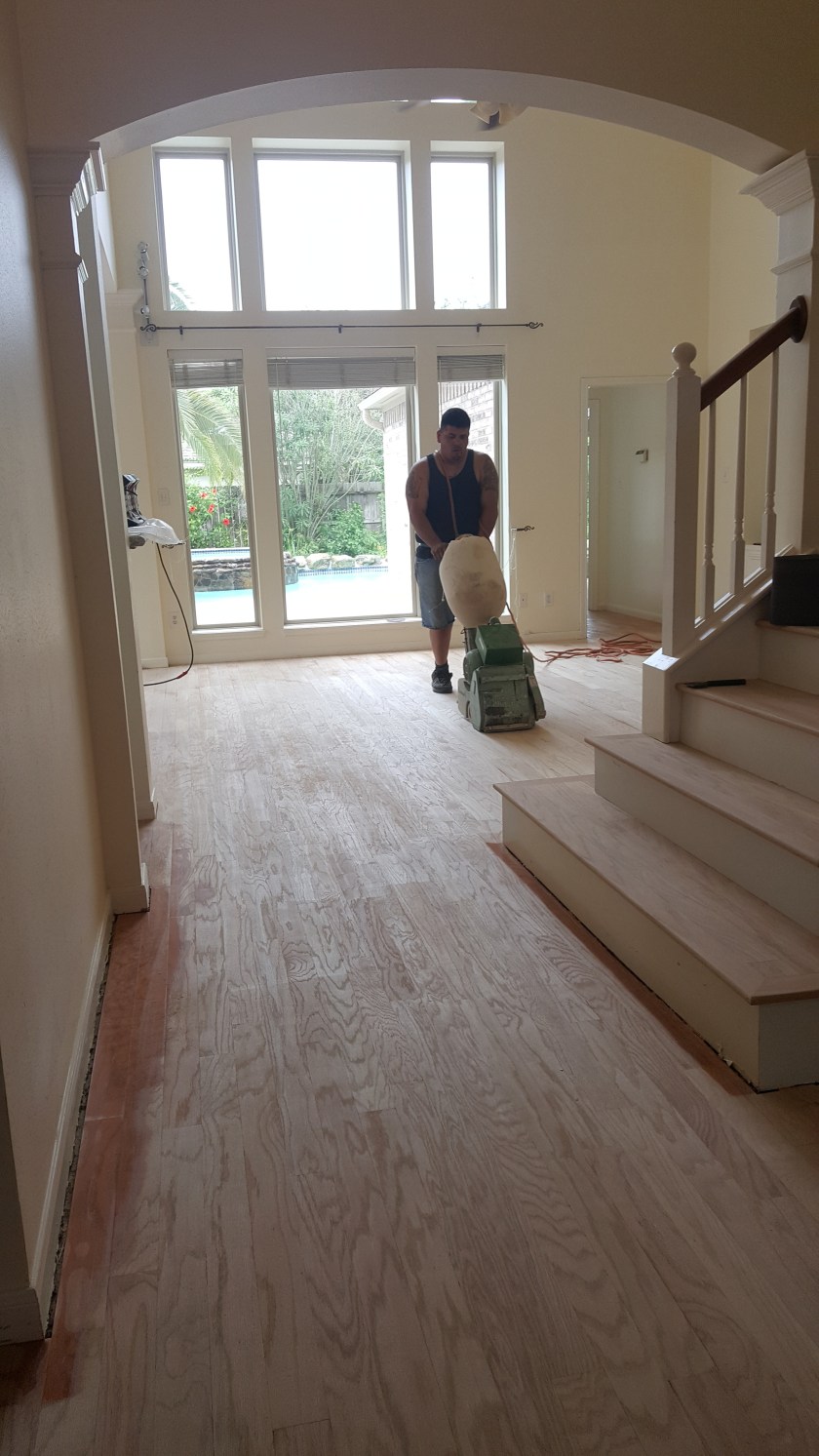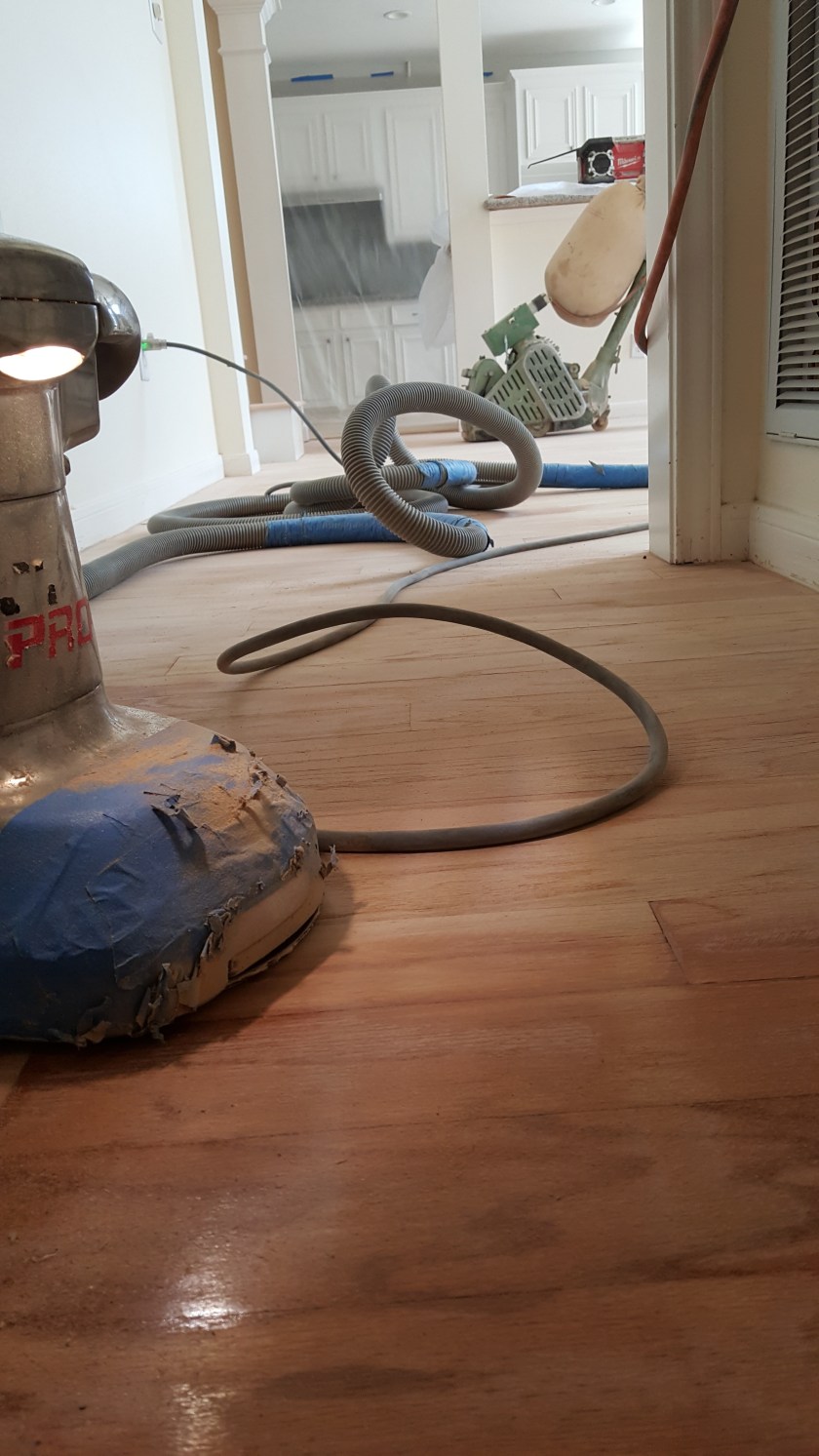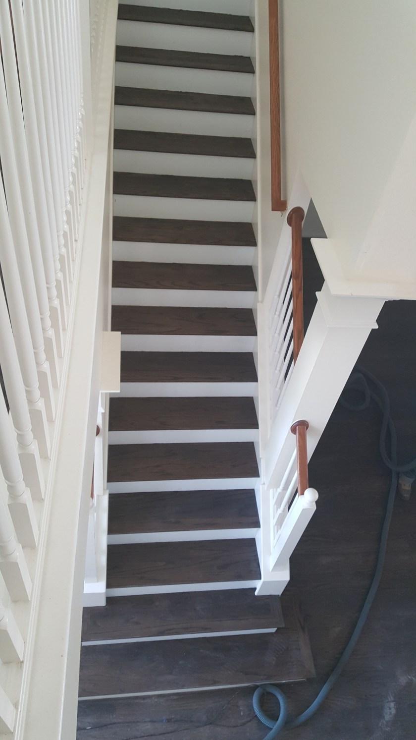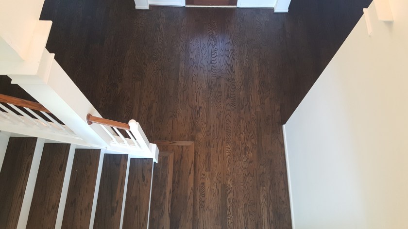 OLDER ENGINEERED WOOD FLOOR NEEDED TO BE UPDATED , NICE COUPLE ALLOWED US TO DO THE REFINISHING. WE SANDED FLOOR TO A RAW SURFACE, DID A CONDITIONER THEN APPLIED A COAT OF EBONY STAIN AND 2 COATS OF OIL MODIFIED MATTE FINISH.